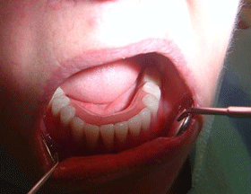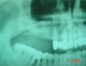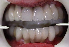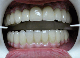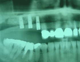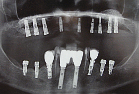 This X-ray shows the final result with the full arch 12 unit dental bridge secured onto 9 Camlog implants (upper jaw) and 4 new dental bridges secured onto 8 Branemark (4 new and 4 previously placed) implants.